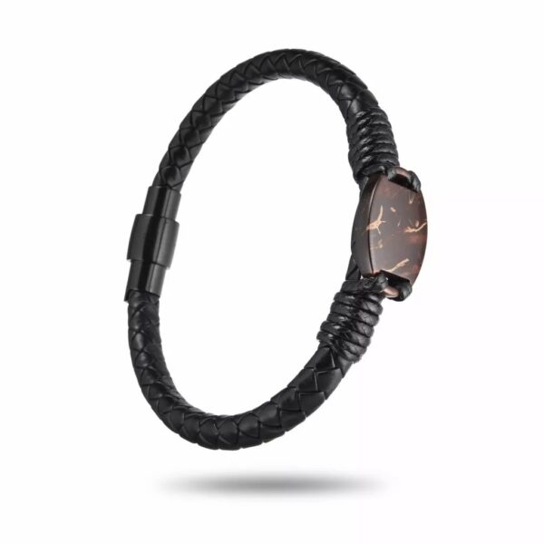 Memopulso Aura associe un cuir noir tressé à un médaillon en véritable noix de coco pour un rendu naturel et élégant. Chaque pièce de coco possède ses propres nuances, ce qui rend chaque bracelet visuellement unique.